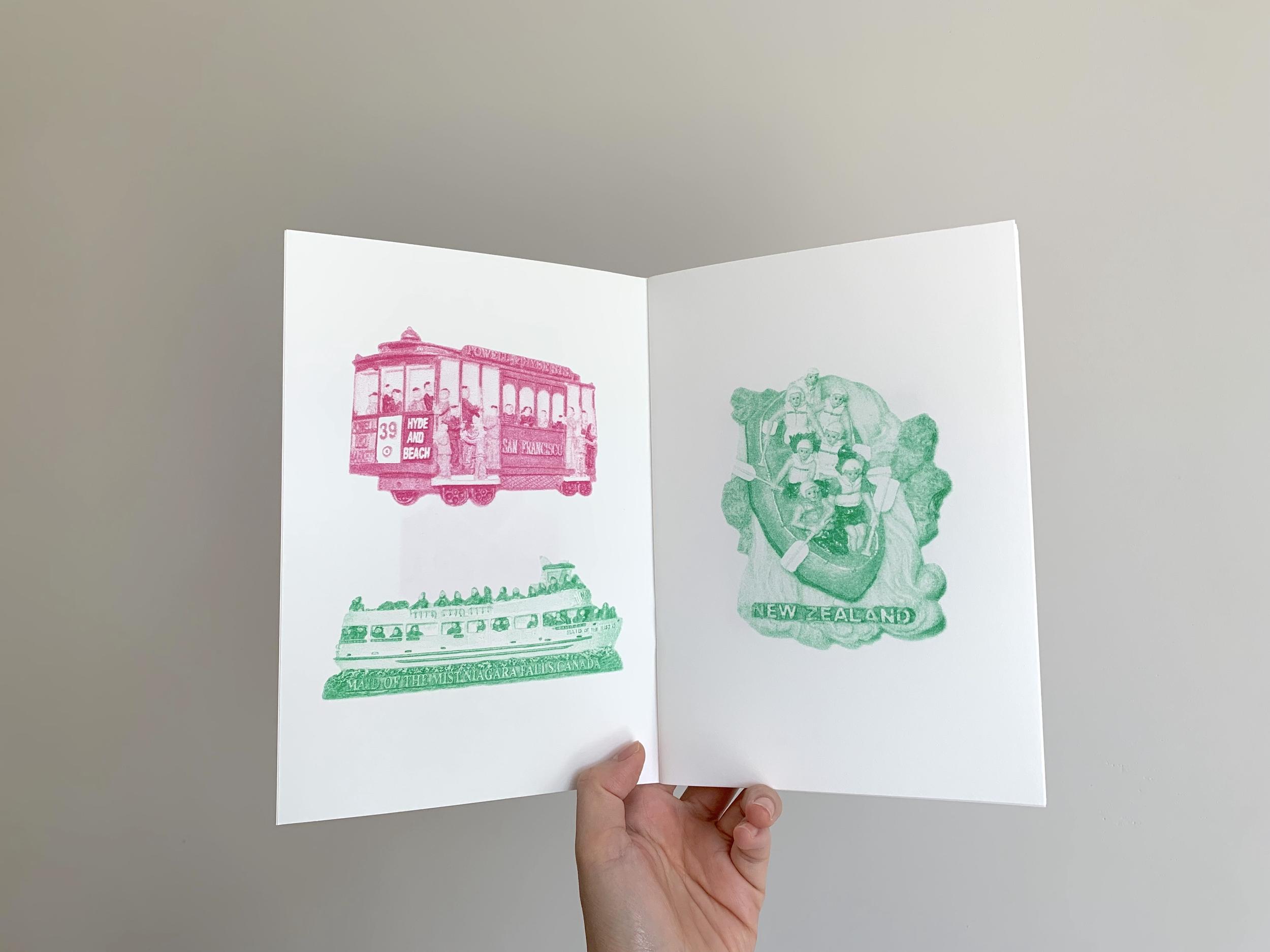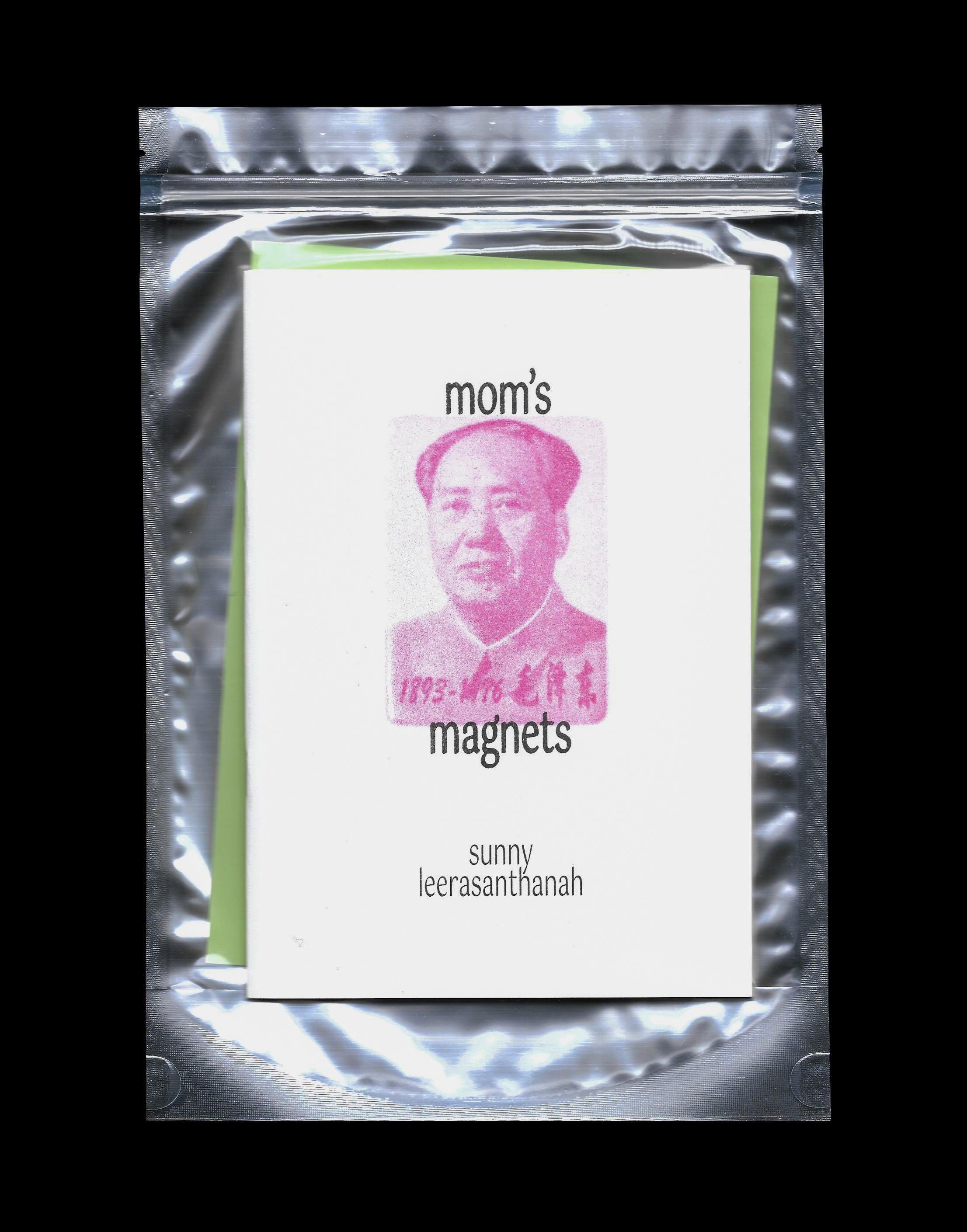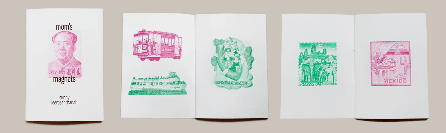 Mom’s Magnets is Leerasanthanah’s typological documentation of their mother’s collection of magnets from worldly destinations. The souvenir magnet is exemplary of reducing culture, place, people, heritage, and politics to commodified kitsch. Patterns reveal the homogenous representations of marketable icons. Playful juxtapositions force a relationship between two seemingly unrelated symbols, like the Egyptian hieroglyph tablet and Britain’s telephone booth. The book contemplates the attempt to embody and possess place and time.